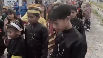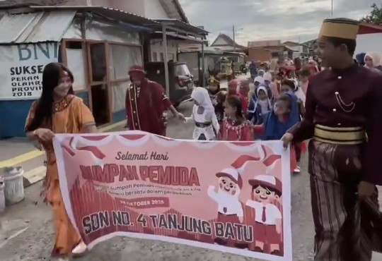 MAJENE, SDN 4 Tanjung Batu Kabupaten Majene, merayakan hari sumpah pemuda ke-97 tahun 2025 dengan melakukan pawai berkeliling menggunakan baju adat nusantara, Selasa (28/10/2025).