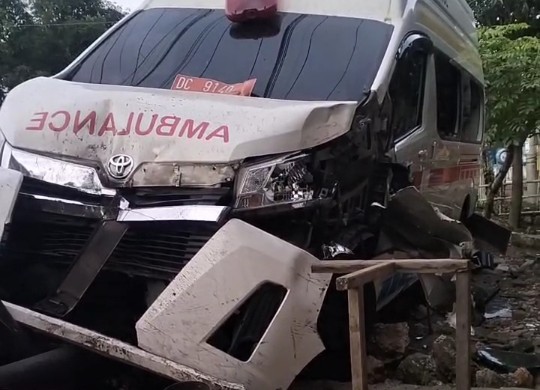 Akibatnya, bagian depan mobil ambulance mengalami ringsek yang cukup berat.