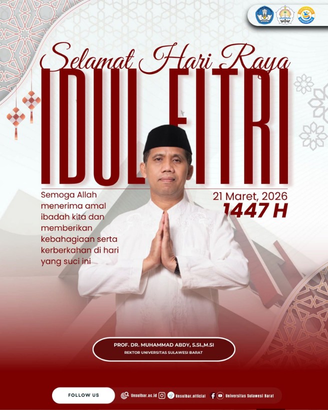 MAJENE, KARABAO.ID – Universitas Sulawesi Barat (Unsulbar) melalui Rektor dan seluruh civitas akademika menyampaikan ucapan Selamat Hari Raya Idul Fitri 1447 Hijriah kepada seluruh masyarakat, khususnya keluarga besar kampus.