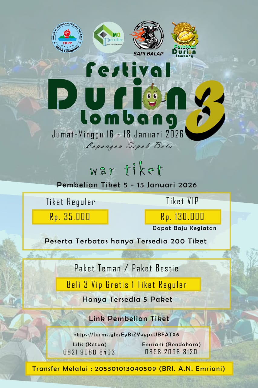 MAJENE, KARABAO.ID – Kabar gembira bagi para pecinta durian. Festival Durian Season III kembali akan digelar di Kabupaten Majene pada Jumat hingga Minggu, 16–18 Januari 2026. Kegiatan tahunan yang selalu dinantikan saat musim durian ini resmi membuka pendaftaran dan pembelian tiket bagi masyarakat umum.