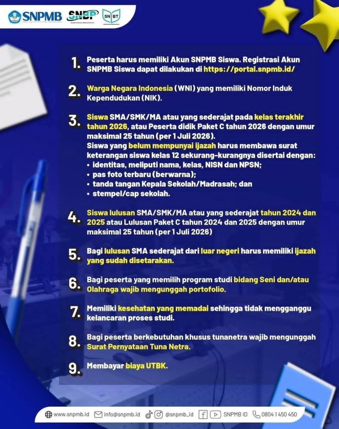 Dengan memahami dan memenuhi seluruh persyaratan tersebut, diharapkan proses pendaftaran UTBK-SNBT 2026 dapat berjalan lancar tanpa kendala berarti. Para calon peserta juga diimbau untuk saling berbagi informasi agar tidak ada yang tertinggal dalam mengikuti tahapan seleksi nasional ini.