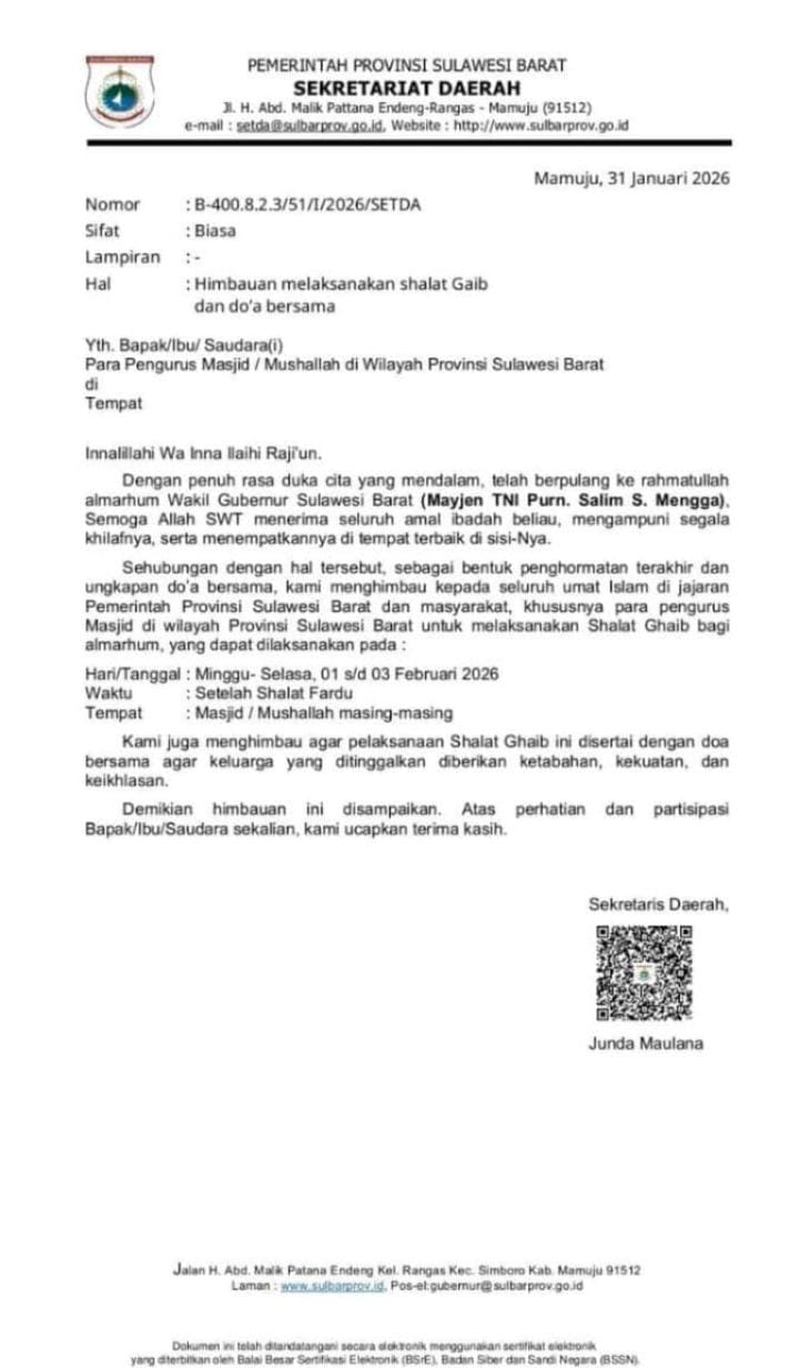 Imbauan tersebut tertuang dalam surat resmi Sekretariat Daerah Provinsi Sulawesi Barat bernomor B-400.8.2.3/51/1/2026/SETDA yang diterbitkan pada 31 Januari 2026. Surat itu disampaikan atas nama Pemerintah Provinsi Sulawesi Barat dalam suasana duka cita mendalam atas wafatnya tokoh daerah yang dinilai telah memberikan pengabdian besar bagi pembangunan dan masyarakat Sulawesi Barat.