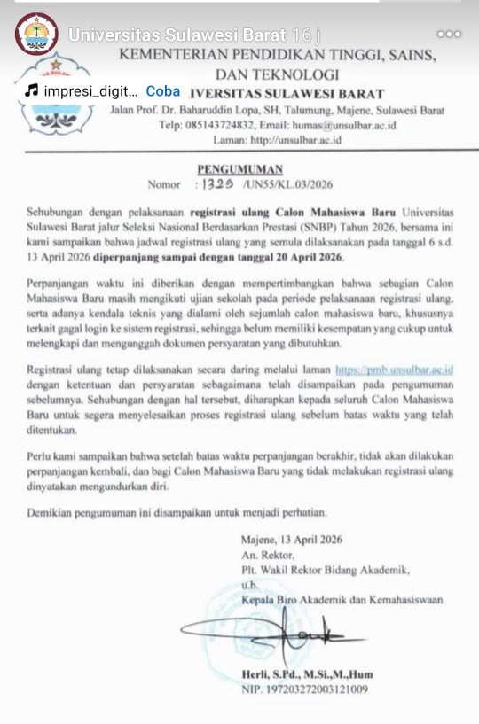 MAJENE, KARABAO.ID — Pihak Universitas Sulawesi Barat resmi memperpanjang masa registrasi ulang bagi calon mahasiswa baru jalur Seleksi Nasional Berdasarkan Prestasi Tahun 2026. Semula dijadwalkan berlangsung pada 6 hingga 13 April 2026, kini masa registrasi diperpanjang hingga 20 April 2026.